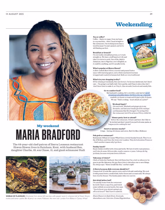 The 44-year-old chef-patron of Sierra Leonean restaurant Shwen Shwen lives in Rainham, Kent, with husband Ben, daughter Charlie, 19, son Chase, 11, and giant schnauzer Rudi